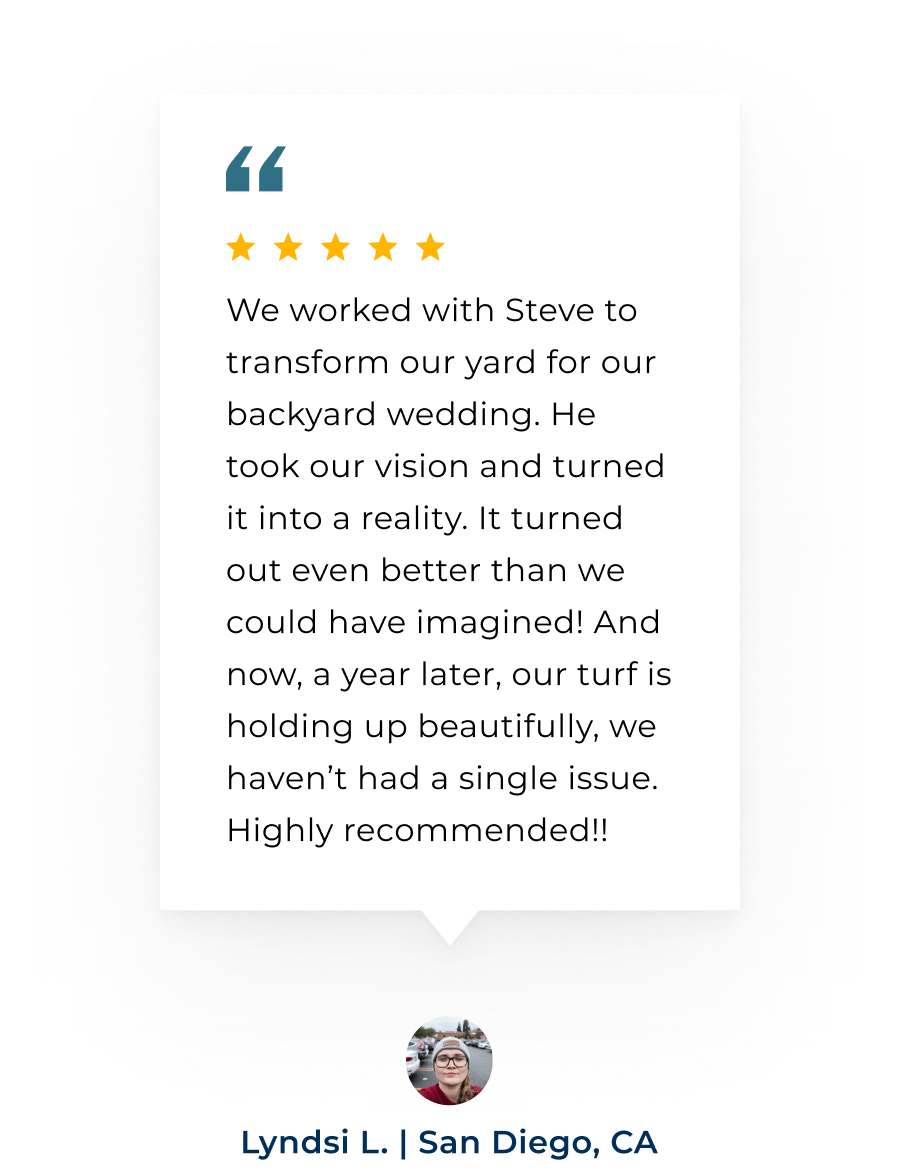 We worked with Steve to transform our yard for our backyard wedding. He took our vision and turned it into a reality. It turned out even better than we could have imagined! And now, a year later, our turf is holding up beautifully, we haven’t had a single issue. Highly recommended!!